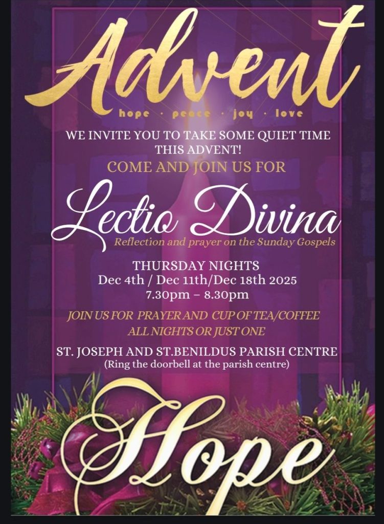 Join us this Advent for a peaceful hour of Lectio Divina. Together we will meditate on the Sunday Gospels as we prepare our hearts for the coming of our Lord.