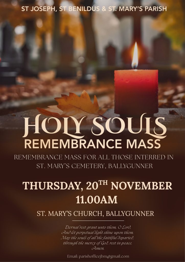 We invite you to join us on Thursday, November 20th at 11:00 a.m. at St Mary’s Church, Ballygunner, as we come together to honour and remember all those who have gone before us – our loved ones who now rest in the sacred grounds of St Mary’s Cemetery.